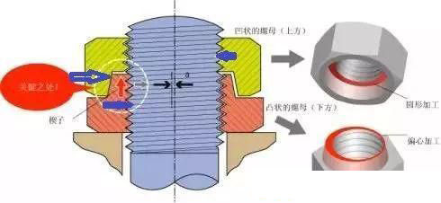 Hard lock 防松螺母是有上下呈“凹”“凸”形狀的兩種螺母組合成的。下方呈凸狀的螺母,在加工時中心稍許錯動(偏心加工),起到楔子的作用。上方呈凹狀的螺母,則不作偏離中心的加工(圓形加工),于是形成了錘子揳打楔子的功能,上下螺母的“凸”面和“凹”面都是錐形面,這樣即使很小的軸向壓力,也可以產(chǎn)生很大的徑向壓力。“凸”“凹”錐面間的壓力會傳遞到上下螺母的咬合螺紋上,螺紋咬合面間和凸凹錐面上都會產(chǎn)生很大的摩擦阻力距,這樣起到防松的作用。