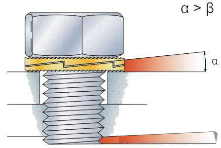 這種墊圈的一面是大斜齒面,在墊圈的另一面有放射狀鋸齒。NORD-LOCK墊圈是大齒面相對,成對安裝的。當擰緊螺栓或螺母時,放射狀鋸齒緊緊咬住接觸面,使NORD-LOCK墊圈分別與螺母和連接件接觸面相對固定,只允許大斜齒面間的相對移動。螺栓或螺母的任何松動趨勢都被大鋸齒的這種楔入效果所阻止。兩片NORD-LOCK墊圈之間的抬升距離大于因螺紋滑動引起的螺栓或螺母抬升的距離。